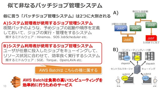 - AWS Batch はユーザが任意に投入したジョブをキューイングして、 リソース状況に合わせて、効率良く実行するシステム